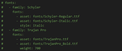 이제 pubspec.yaml 파일에 들어가 fonts 부분을 수정해야 합니다.