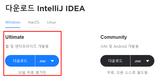 현재 IntelliJ는 무료 버전(Community 에디션)과 유료 버전(Ultimate)는 기능 차이가 많다.