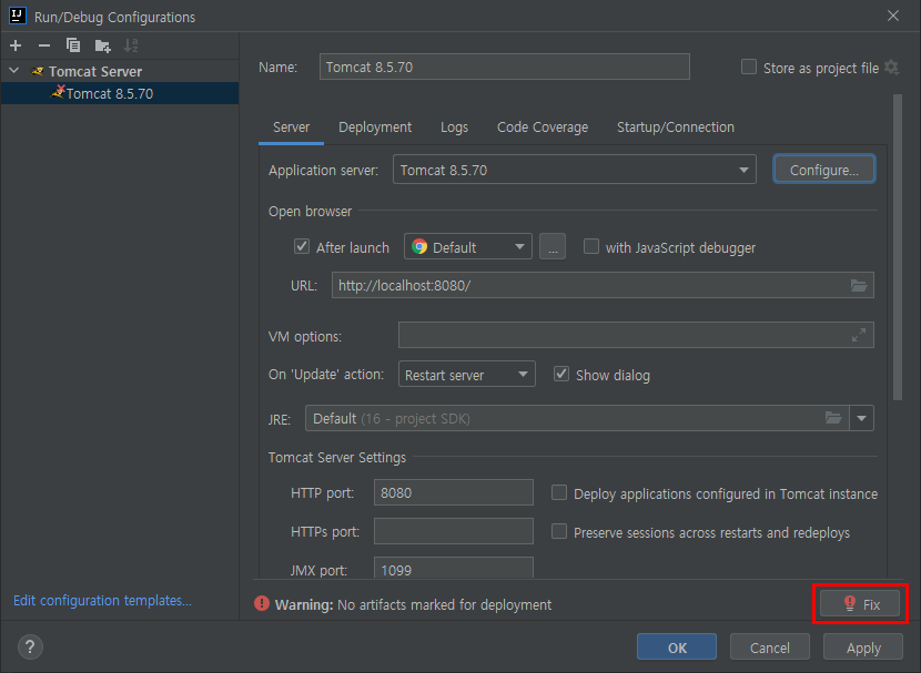 아래의 Fix 클릭 → Application context / 로 변경 → OK 클릭