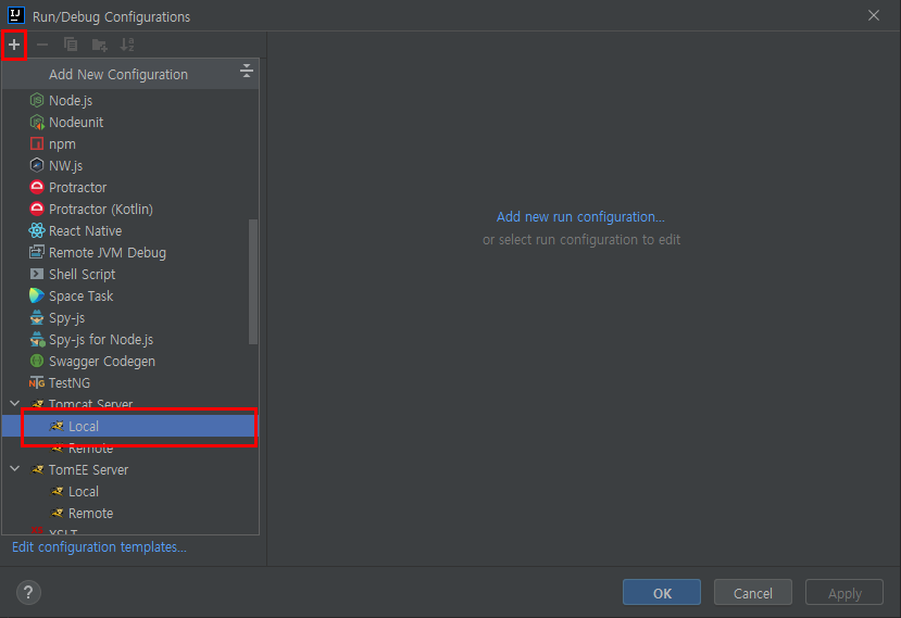 * Application server에 Tomcat이 없다면 Configure..를 클릭하여 설치된 톰캣 폴더 설정 (아래와 같이 설정)