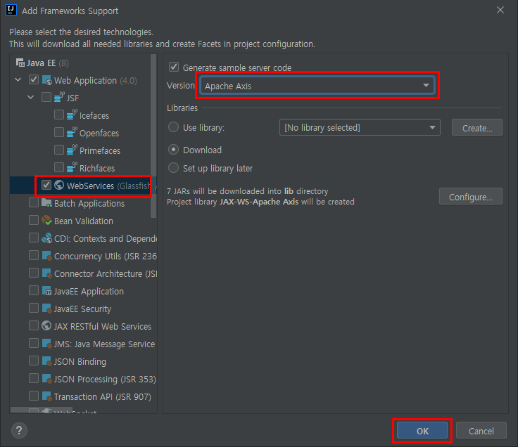WebServices 클릭 → Version [Apache Axis]로 변경 → OK 클릭
